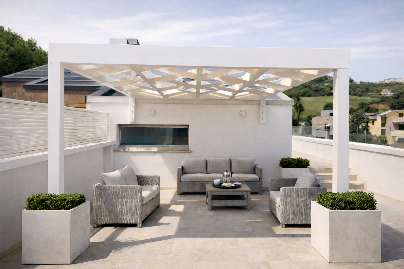 Realizzazione di pergola su misura con struttura in legno trattato e finitura protettiva, integrata con copertura ombreggiante e arredo coordinato per creare una zona relax funzionale e armonizzata con l’architettura dell’immobile.