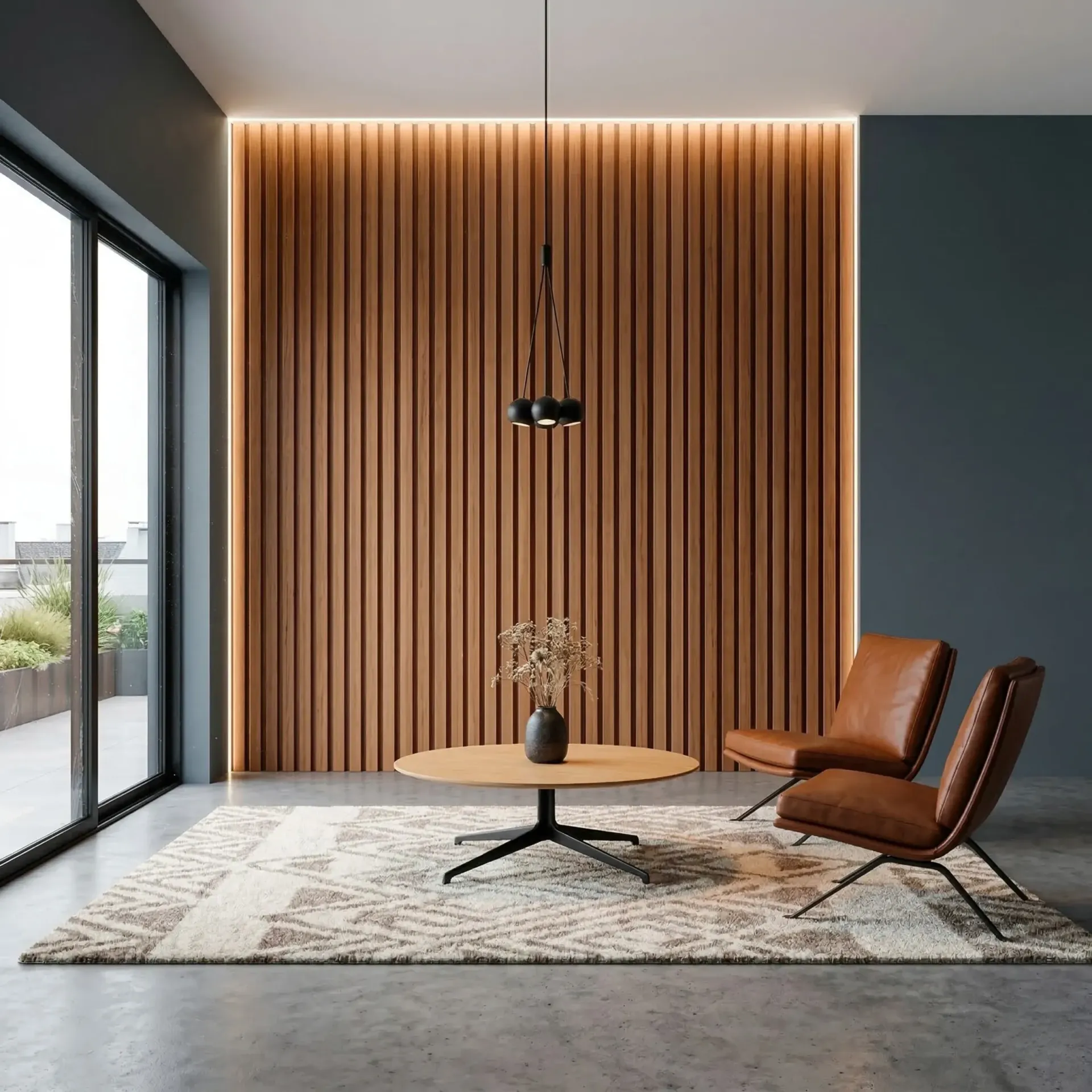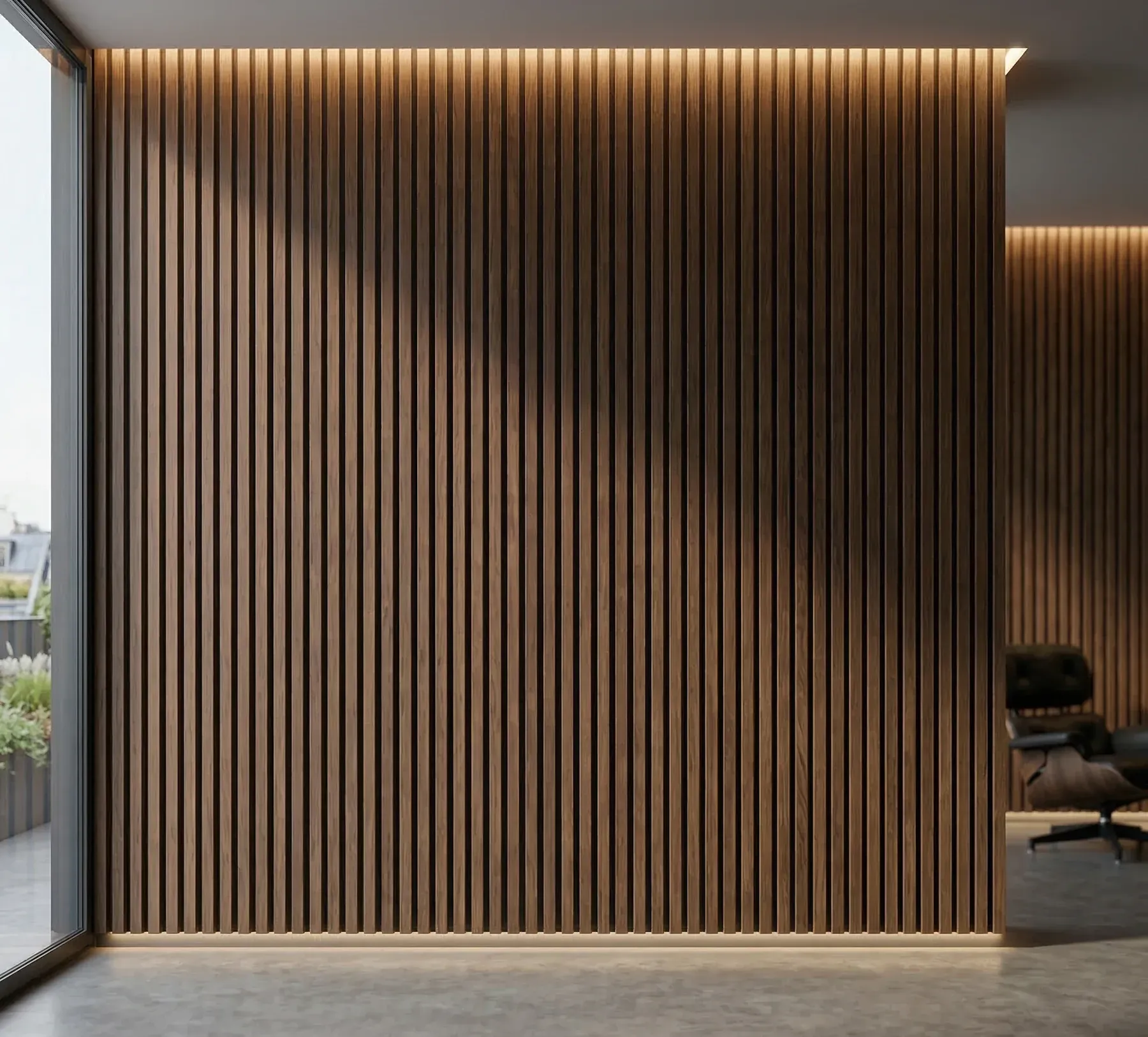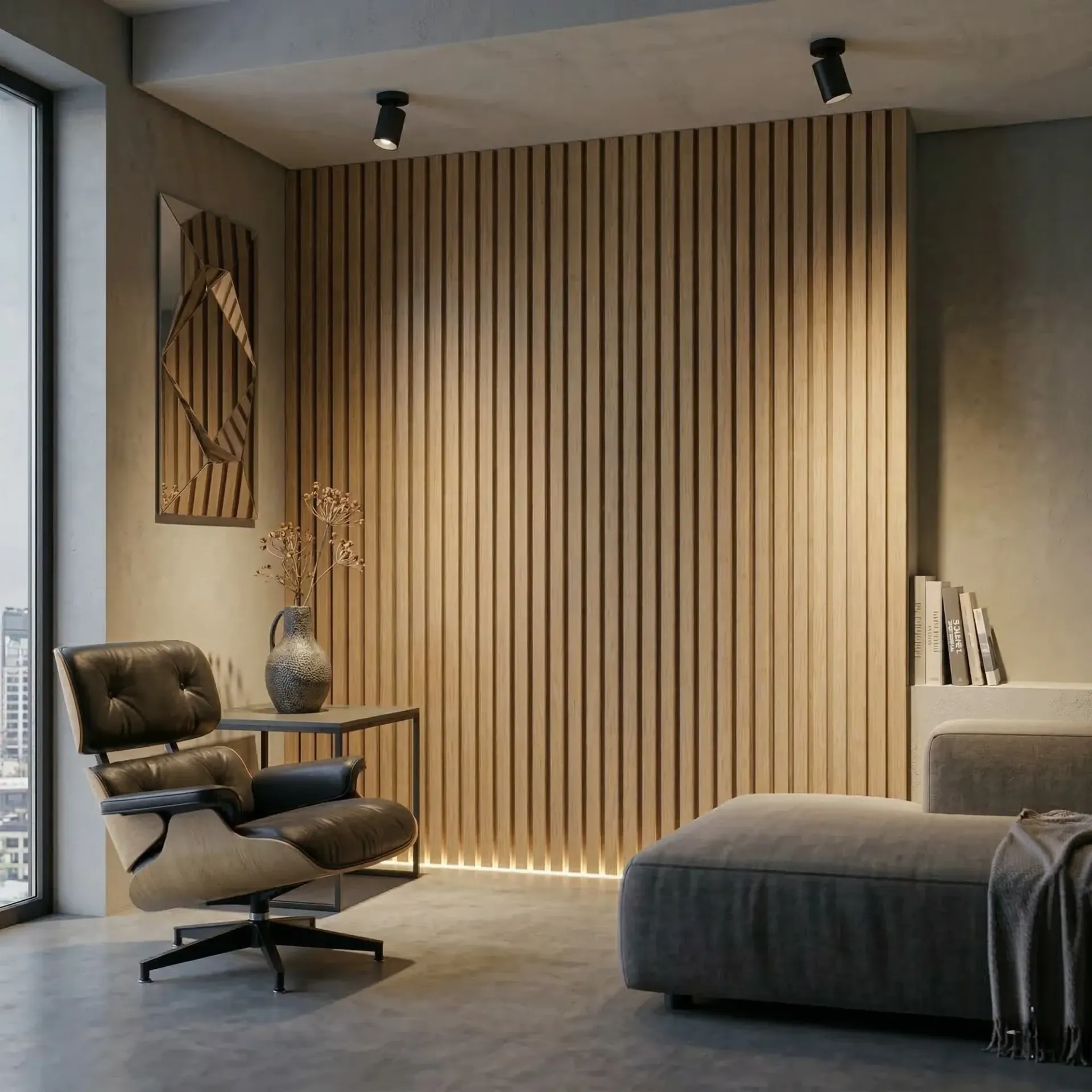 Pannelli a listelli in MDF progettati per combinare estetica moderna e funzionalità acustica.